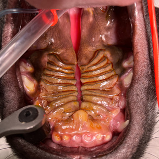 術後は1-2週間食道婁チューブを設置して給餌、口腔内の術創を清潔に刺激なく治癒させました。